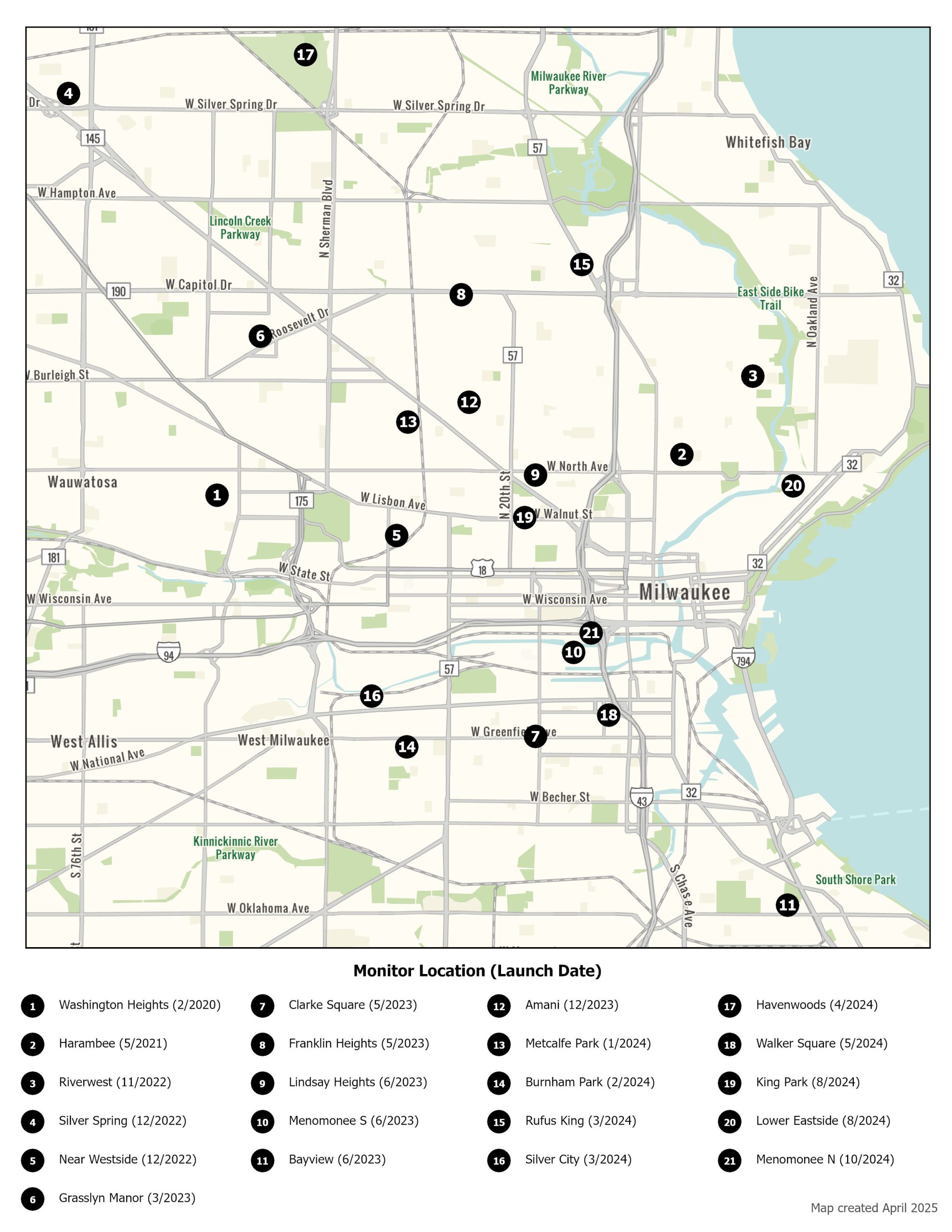 MKE FreshAir Collective had 21 active sensors in 2024. The data from each sensor were analyzed and visualized, alongside neighborhood demographic data from the American Community Survey. The neighborhood summaries are included in the full report, or can be accessed individually, below the following reference map.